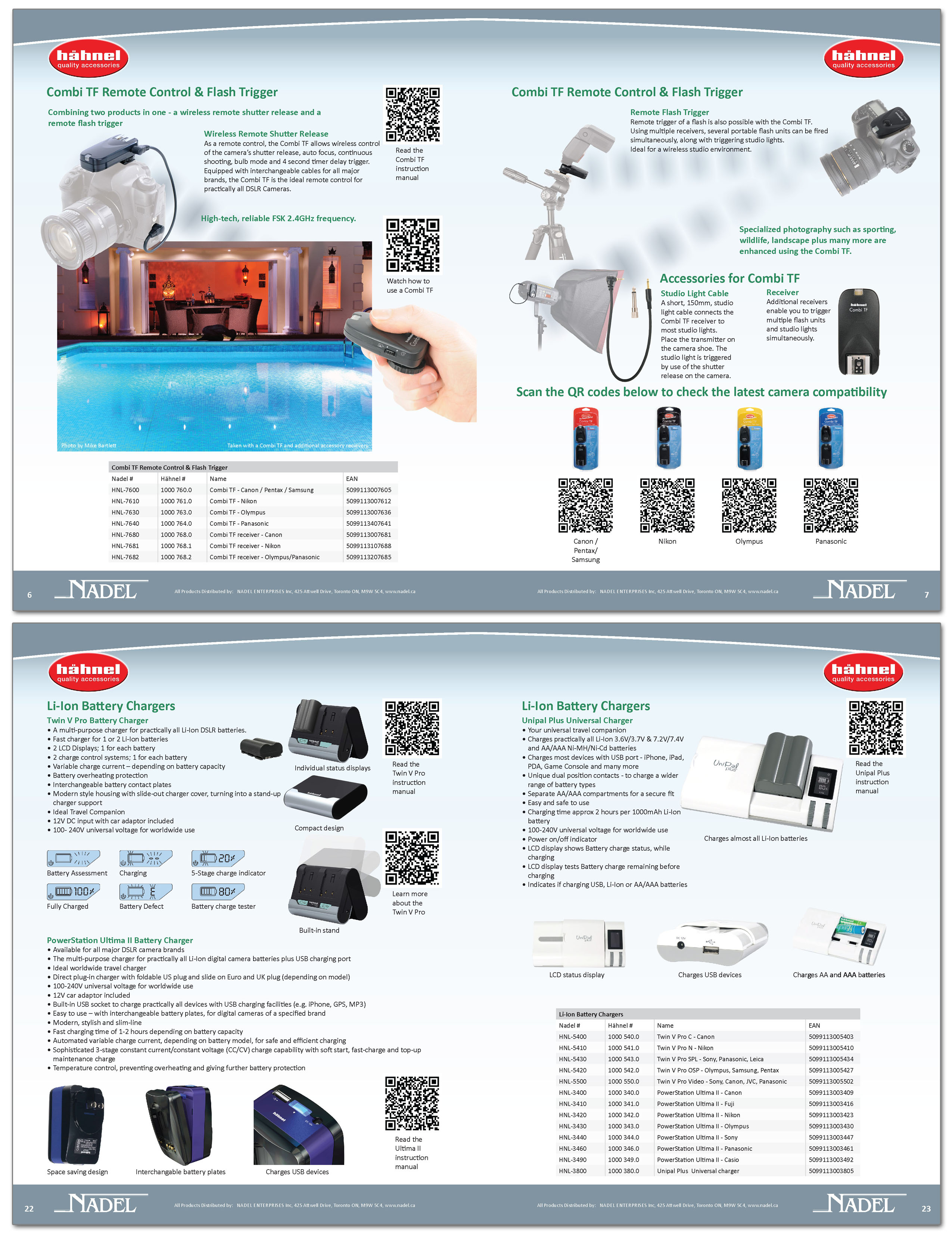 24 page catalog for camera accessory manufacturer. As well listing products, the catalog is a training guide for sales associates. It includes QR codes that link to online instruction manuals, compatibility listings and demonstration videos.