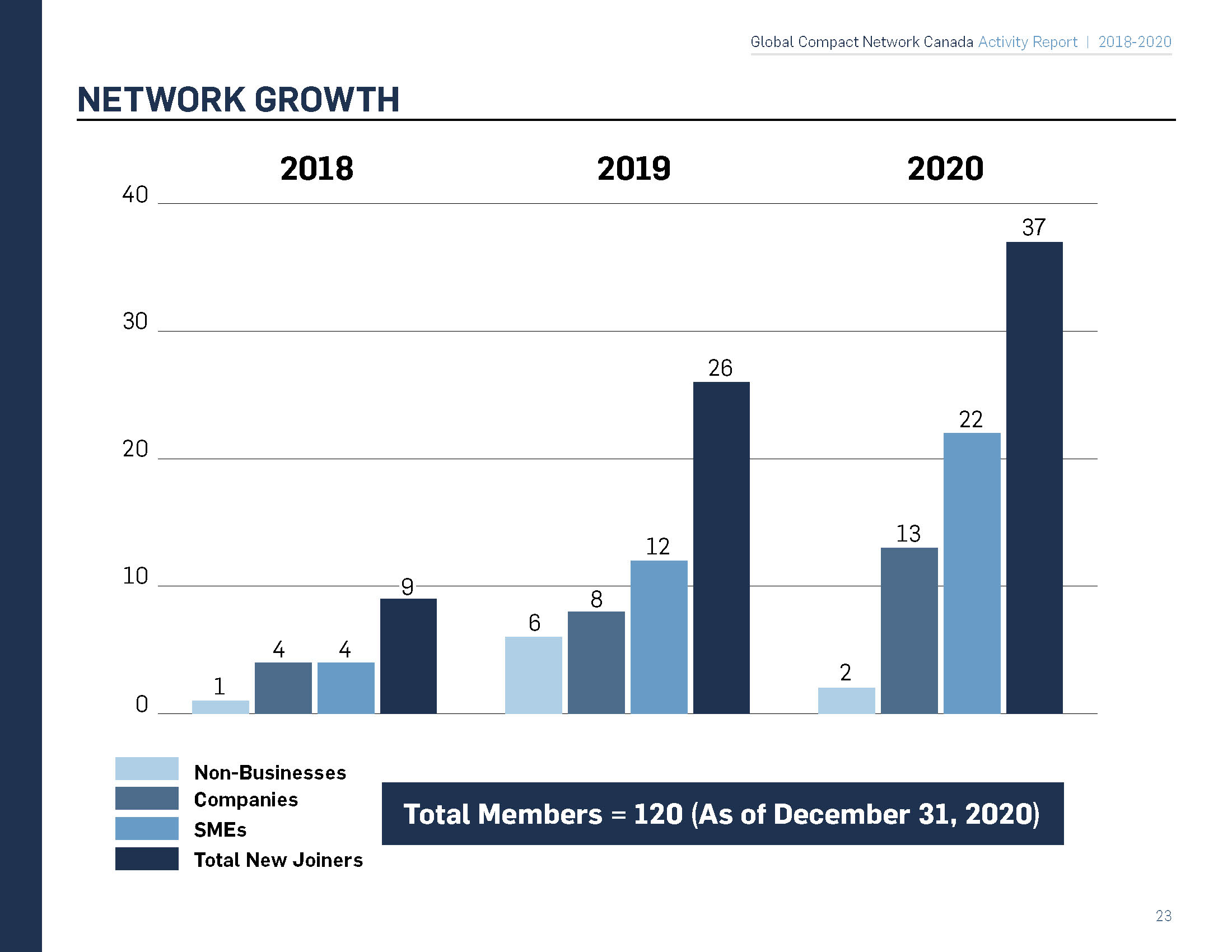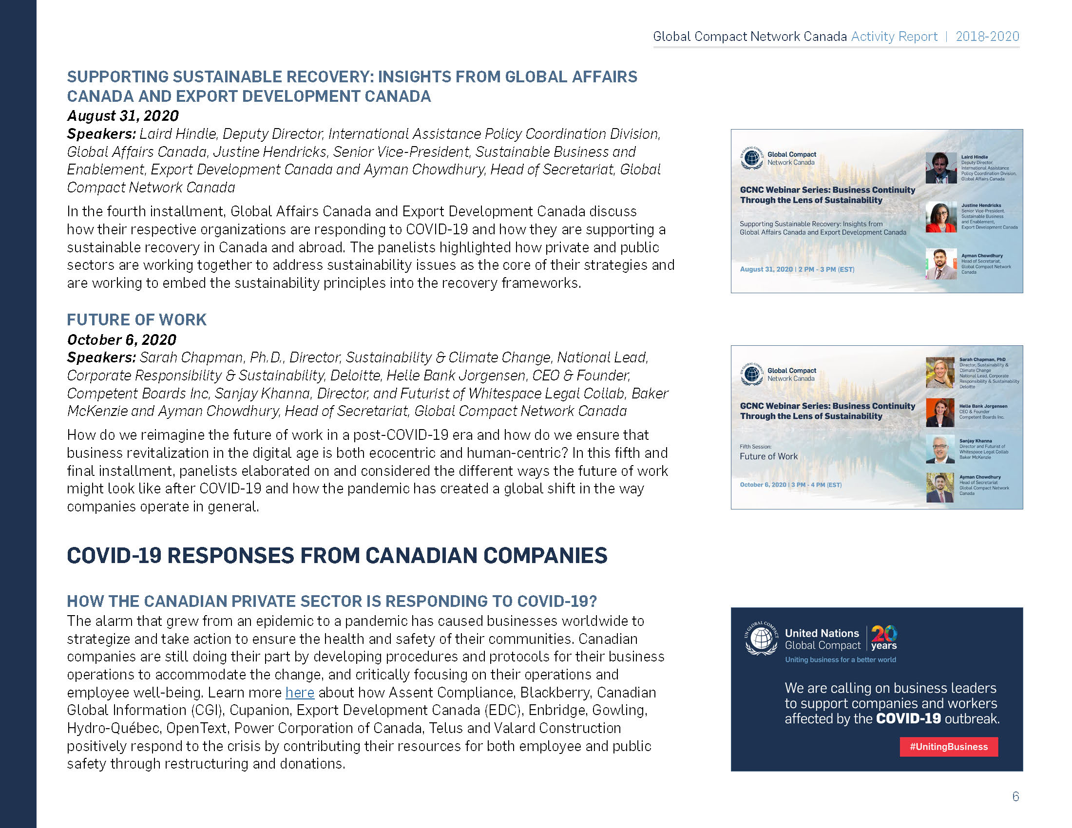 Multi-year activity report for UN Global Compact Canada. This report lists the programs, seminars, membership and financial information for this non-profit organization.
